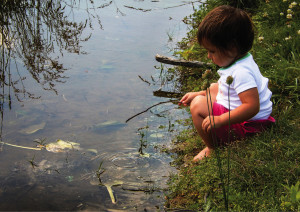 Actively and playfully engaging in the natural world in her own backyard, Lucia experiences sights, sounds, smells, tastes and textures that inspire intrinsic curiosity. Diversity pulls forth a natural sense of wonder and appreciation for life. Frogs croak. Wild grasses reflect in reverse image on the still pond. The images change as a stick is dipped into the water. Such experiences in nature go beyond the physical senses that help connect her with nature. – Jen Mendez