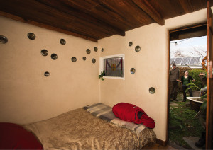 This tiny bungalow was once a run down shed. Rather than rebuild from scratch Kat and Nick reused the timber frame, packing it with a straw and clay mix then rendering with fermented earth plaster. Creative use of glass bottles and refinished fence pailings for the ceiling beautify the space. The extra room provides a space for WWOOFers who, along with their hosts, contribute to the thriving garden that makes the most of every part of this small urban property.
